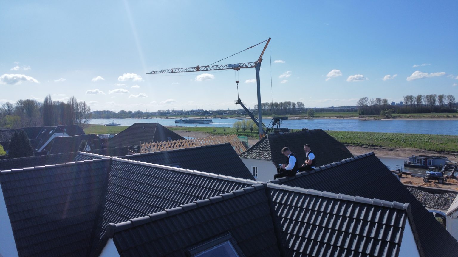 Aufbau des Dachstuhls: Das erfahrene Team führt den Aufbau des Dachstuhls präzise und termingerecht durch, wobei stetige Kommunikation mit Familie Bergmann gepflegt wird.