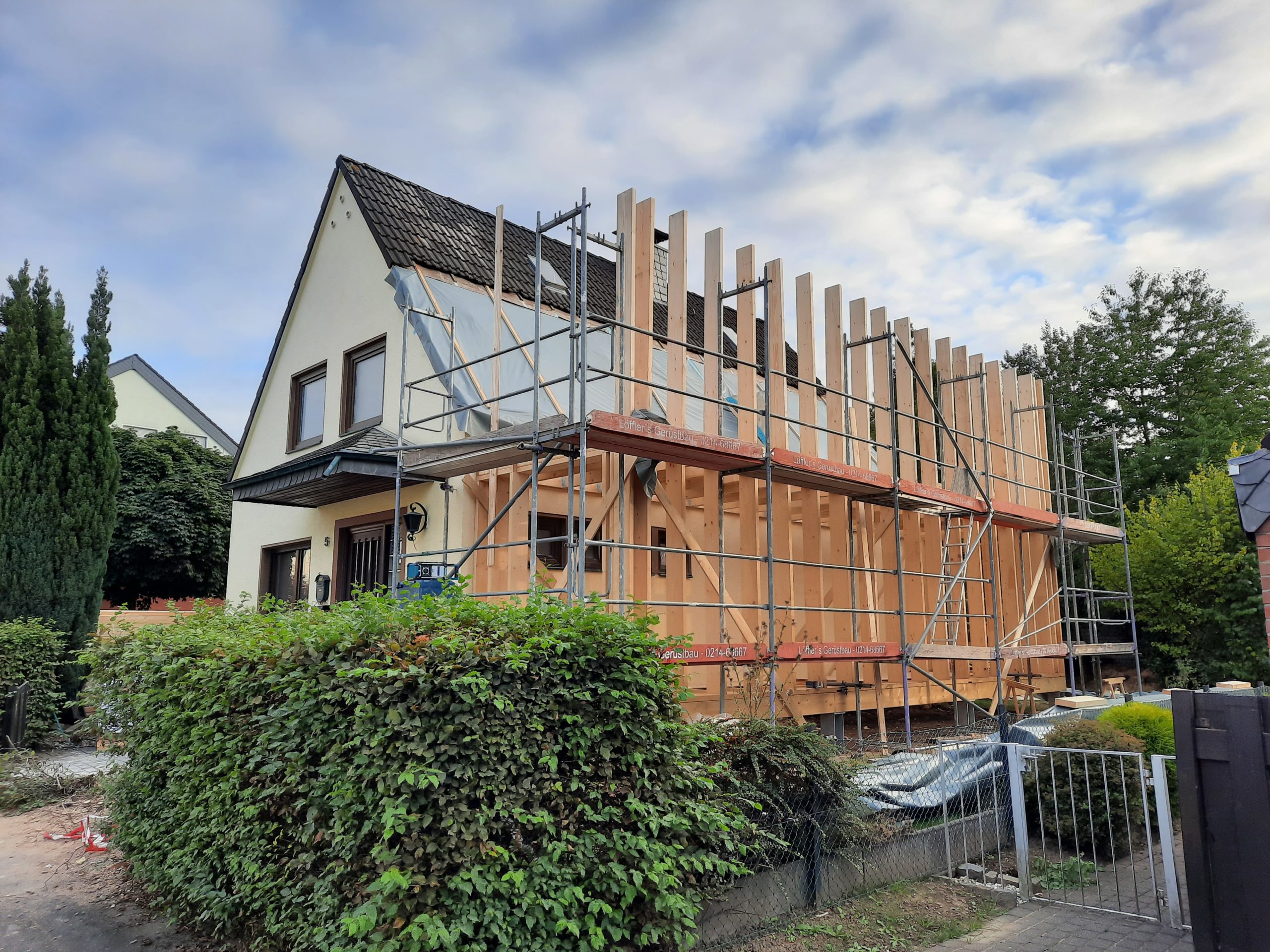 Der Holzrahmenbau ist eine moderne Bauweise, bei der Wände, Decken und Dächer aus einem tragenden Holzskelett bestehen und mit Plattenwerkstoffen wie OSB oder Gipsfaserplatten beplankt werden. Diese Technik ermöglicht umweltfreundliche Bauprojekte mit hervorragender Dämmung. Auf dem Bild sehen Sie einen geplanten Anbau und die Erweiterung des Dachgeschosses – ein Beispiel für die Flexibilität des Holzrahmenbaus. Die Firma Firstetage aus Leverkusen bringt umfassende Fachkenntnisse in diesen Prozess ein. Unser erfahrenes Team realisiert individuelle Lösungen und garantiert höchste Qualitätsstandards in Planung und Ausführung. Vertrauen Sie auf Firstetage, um Ihr Zuhause effizient zu erweitern.